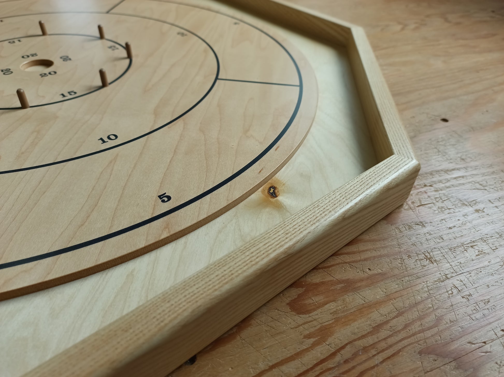 - Traditional octagon crokinole board with 23-5/8" playing surface and an overall diameter of 28-3/4"