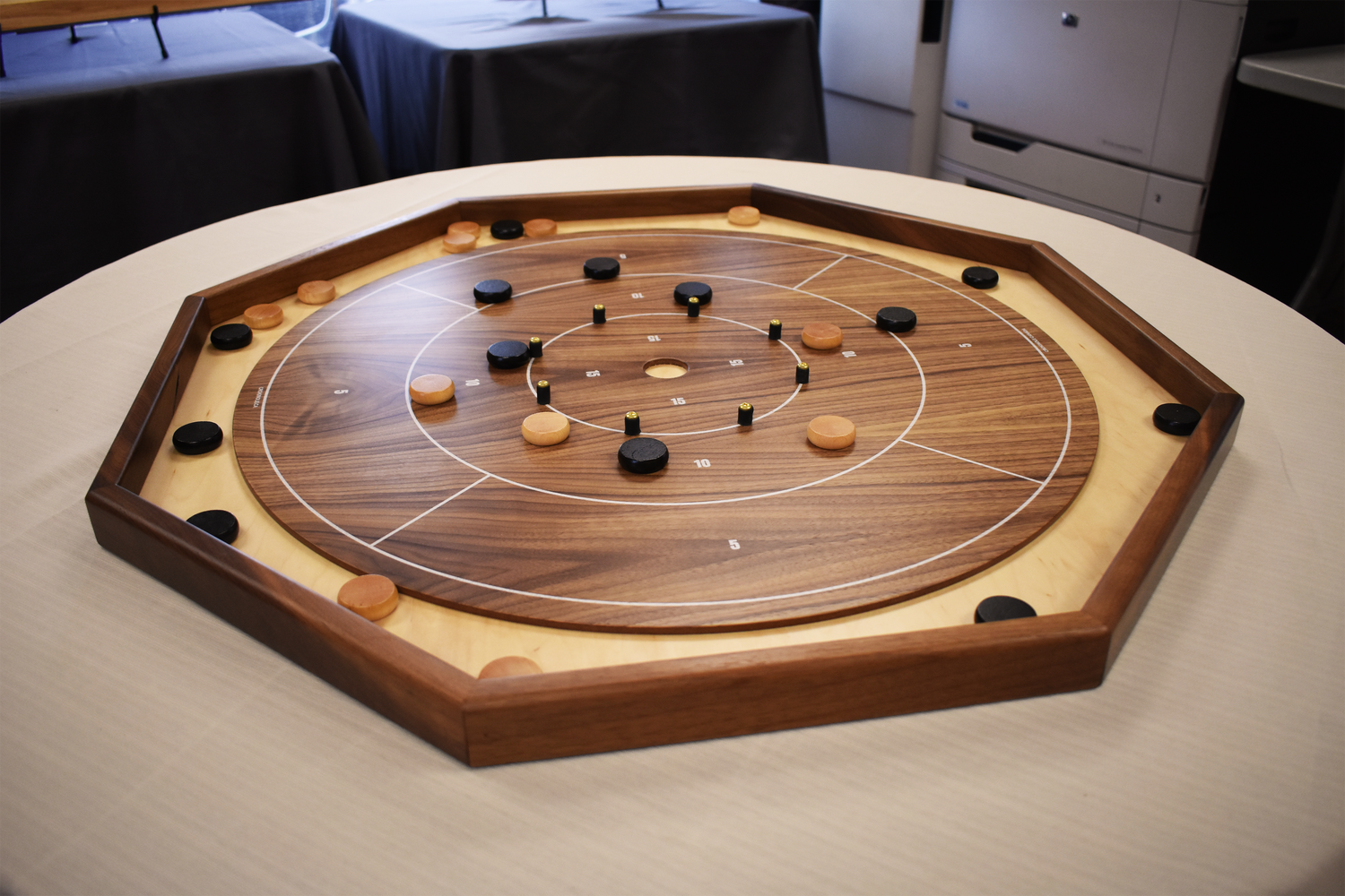 The Walnut Grove is a beautiful-looking, traditional octagon crokinole board. It features a walnut surface and rails. The lines and numbers on the board are UV light printed. It has bouncy, latex-covered posts. The back of the board features a checkerboard. This board comes with everything you need to play including the rules.